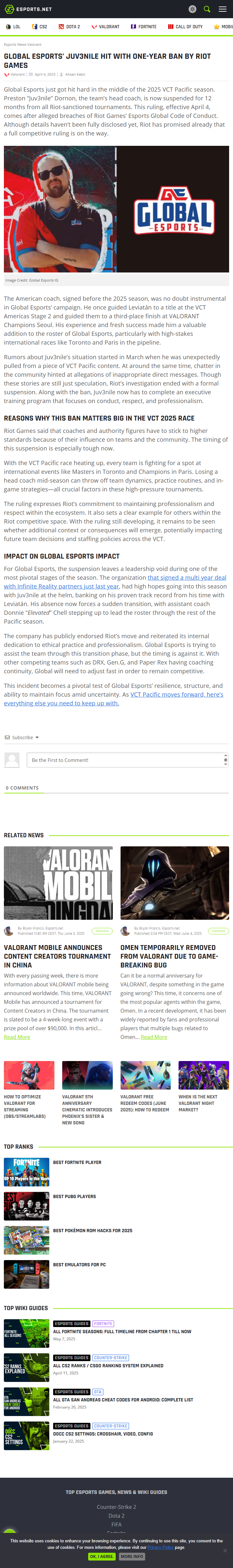 Riot Games has announced the suspension of Global Esports' head coach, Preston "Juv3nile" Dornon, for a period of 12 months, effective from April 4, 2025, following potential breaches of its Esports Global Code of Conduct.