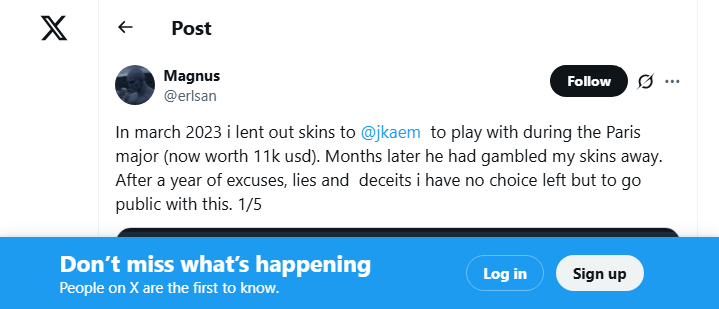Joakim "⁠jkaem⁠" Myrbostad, the Norwegian rifler, has been publicly accused of owing $10,000 in skins to trader erlsan, with the debt originating from loans made for the Paris Major.