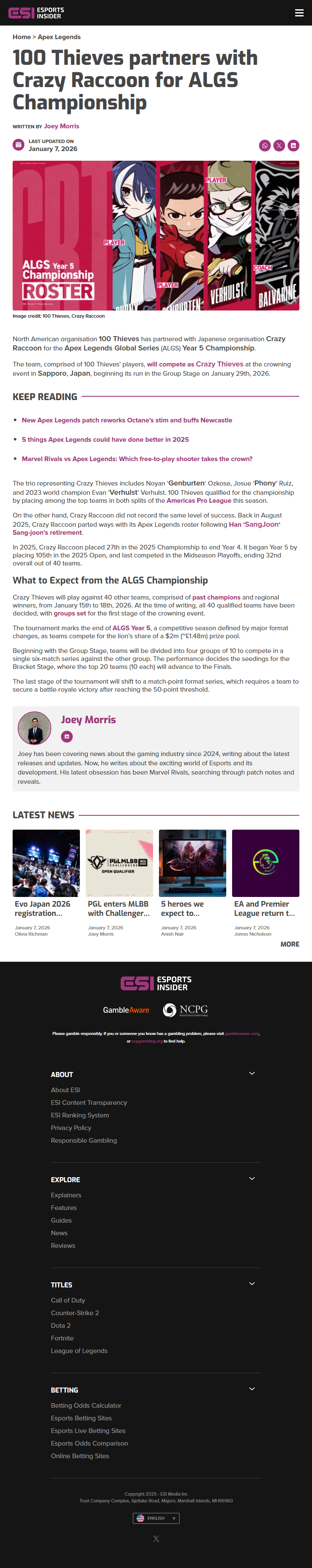North American esports team 100 Thieves has joined forces with Japanese organization Crazy Raccoon for the upcoming Apex Legends Global Series (ALGS) Year 5 Championship. The partnership allows 100 Thieves' roster to compete under the banner Crazy Thieves at the event in Sapporo, Japan.The ALGS Year 5 Championship, the grand finale of the 2025-2026 competitive season, is set to take place from January 15 to 18, 2026, at the Daiwa House PREMIST DOME. With a massive $2 million prize pool on the line, 40 of the world's top Apex Legends teams will battle it out for the title.