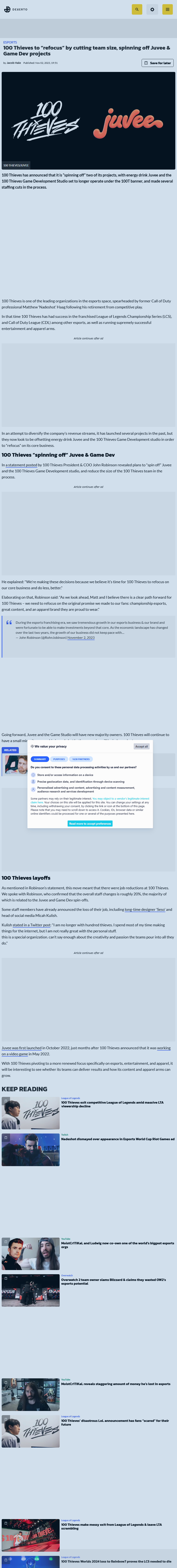 John Robinson stated "Today we announced that we’re spinning off Juvee and our 100 Thieves Game Development studio, and reducing the size of the 100 Thieves team. We’re making these changes because we believe it’s time for 100 Thieves to refocus on our core business and do less, better.During the esports franchising era, we saw tremendous growth in our esports business & our brand and were fortunate to be able to make investments beyond that core. As the economic landscape has changed over the last two years, the growth of our business did not keep pace with the growth of our organization."