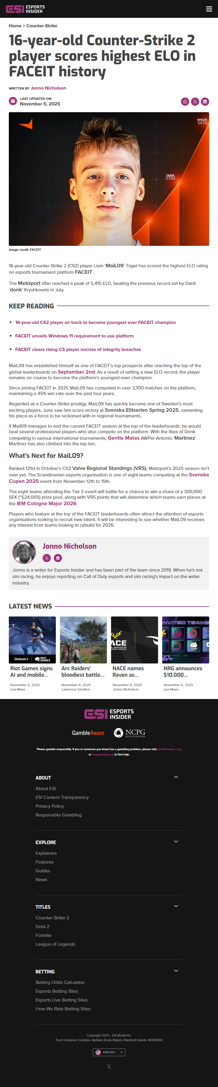 Liam 'MaiL09' Tügel, a 16-year-old Counter-Strike 2 (CS2) player, has made history by setting the highest ELO rating ever on the FACEIT esports tournament platform. His new record is an impressive 5,415 ELO, surpassing the previous record of 5,395 set by Danil 'donk' Kryshkovets just a few months ago in July.