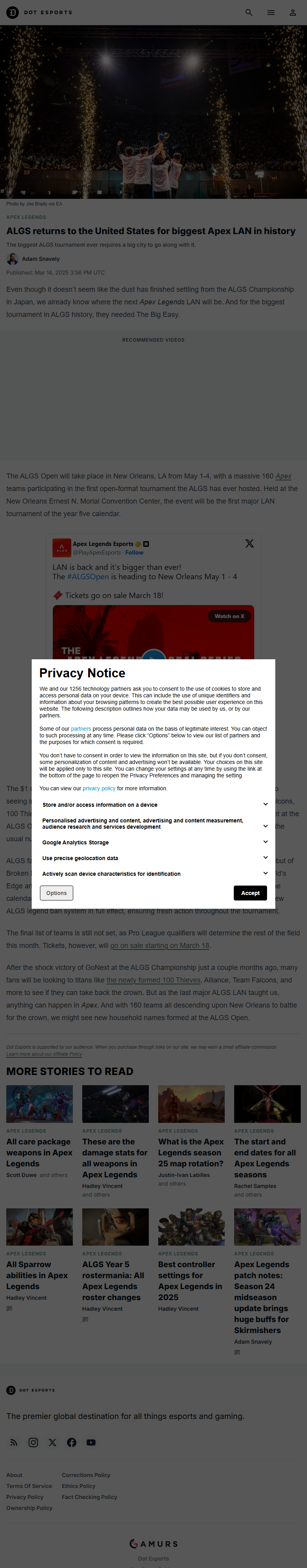 The ALGS Open will take place in New Orleans, LA, from May 1-4, featuring a massive 160 Apex teams in the first-ever open-format tournament hosted by the ALGS. The event will be held at the New Orleans Ernest N. Morial Convention Center and marks the first major LAN tournament of the year for ALGS.