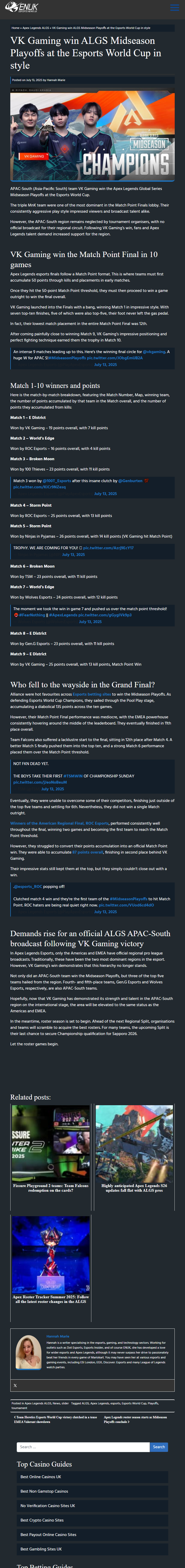 VK Gaming has taken the Apex Legends world by storm, clinching the ALGS Midseason Playoffs title at the Esports World Cup after a commanding performance in the Match Point Finals. Representing the often-overlooked APAC-South region, VK’s victory not only made history but reignited conversations about regional support and representation in competitive Apex.