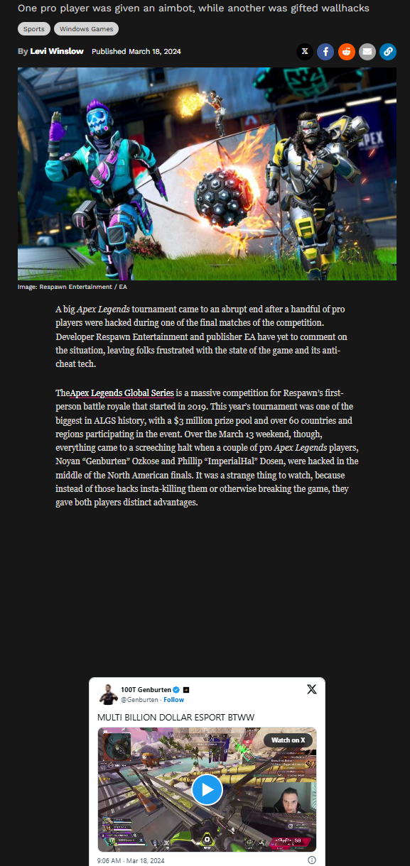 The Apex Legends Global Series (ALGS) regional finals for North America have been postponed following incidents where two players were hacked during gameplay over the weekend. Interestingly, it appears that the game's own anti-cheat software might be responsible for the issue. GenBurten from DarkZero was the first to be affected, experiencing an unexpected ability to see enemy players through walls amid a match. Subsequently, ImperialHal from TSM encountered unintentional aimbotting.