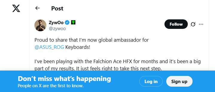 “I’m incredibly excited to join ROG,” said ZywOo in a statement. “Since I started playing with their keyboards, I’ve been really impressed. It just clicks with my style. It’s been amazing to use them to win so many events, and I’m proud to take this partnership further.”