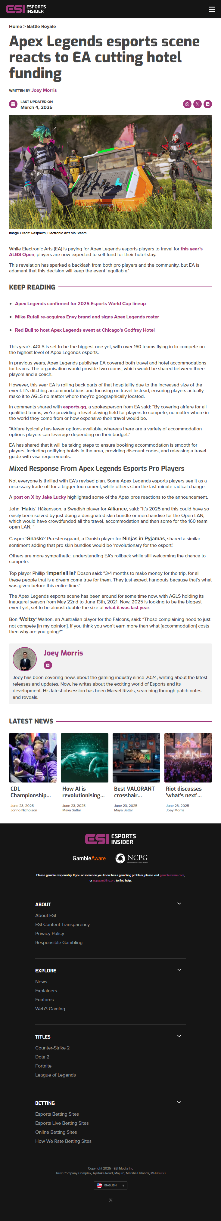 Electronic Arts has announced that it will cover the travel costs for Apex Legends esports players attending this year’s ALGS Open, but players will now be responsible for funding their own hotel accommodations.