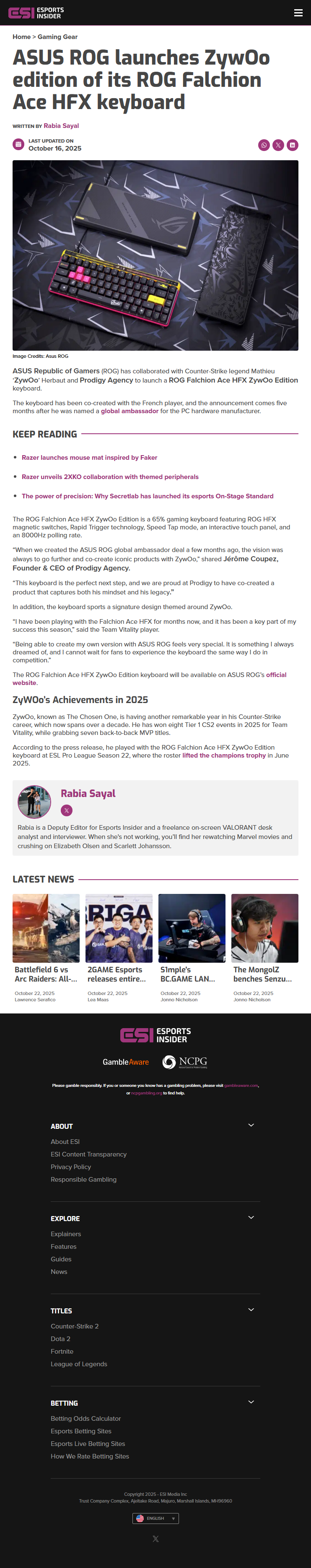 ASUS Republic of Gamers (ROG) has officially launched a special edition of its Falchion Ace HFX keyboard, co-designed with renowned Counter-Strike professional Mathieu ‘ZywOo’ Herbaut. The new model, dubbed the ROG Falchion Ace HFX ZywOo Edition, was developed in partnership with ZywOo and Prodigy Agency, further deepening the esports star’s ongoing collaboration with the gaming hardware brand.