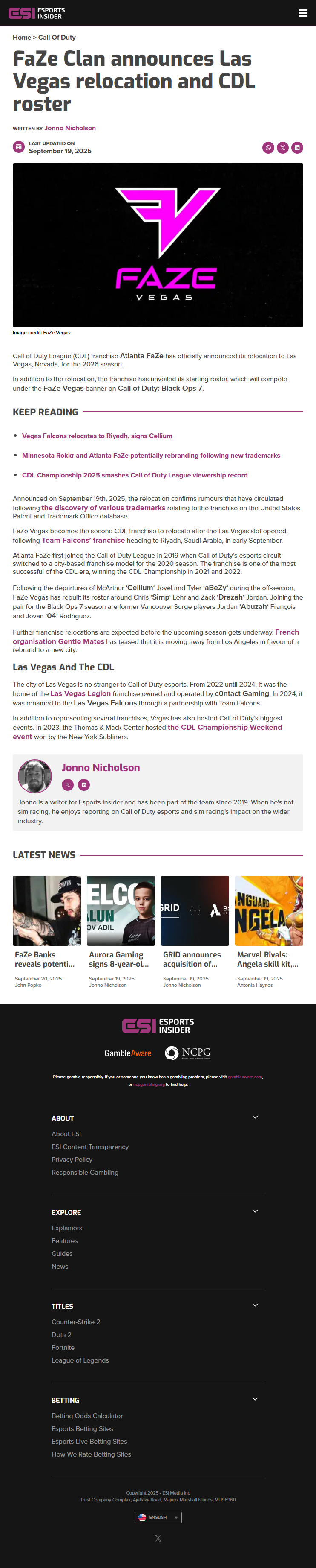 FaZe Vegas becomes the second team to announce a move ahead of the 2026 season. Earlier in September, Team Falcons confirmed their departure from the CDL and relocation to Riyadh, Saudi Arabia, marking a significant shift in the international scope of the league.