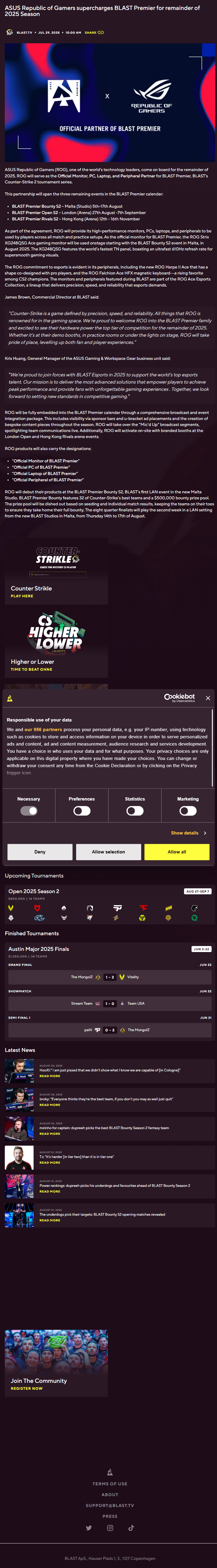 “Counter-Strike is a game defined by precision, speed, and reliability. All things that ROG is renowned for in the gaming space. We’re proud to welcome ROG into the BLAST Premier family and excited to see their hardware power the top tier of competition for the remainder of 2025. Whether it's at their demo booths, in practice rooms or under the lights on stage, ROG will take pride of place, levelling up both fan and player experiences.”