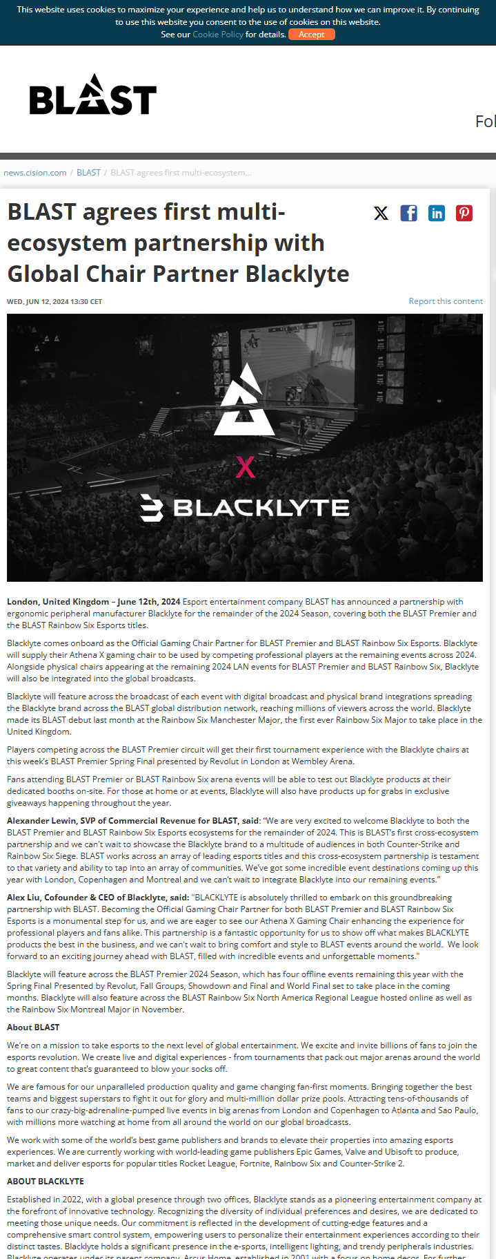 Alexander Lewin, SVP of Commercial Revenue for BLAST, stated “We are very excited to welcome Blacklyte to both the BLAST Premier and BLAST Rainbow Six Esports ecosystems for the remainder of 2024. This is BLAST’s first cross-ecosystem partnership and we can't wait to showcase the Blacklyte brand to a multitude of audiences in both Counter-Strike and Rainbow Six Siege. BLAST works across an array of leading esports titles and this cross-ecosystem partnership is testament to that variety and ability to tap into an array of communities. We’ve got some incredible event destinations coming up this year with London, Copenhagen and Montreal and we can’t wait to integrate Blacklyte into our remaining events.”
