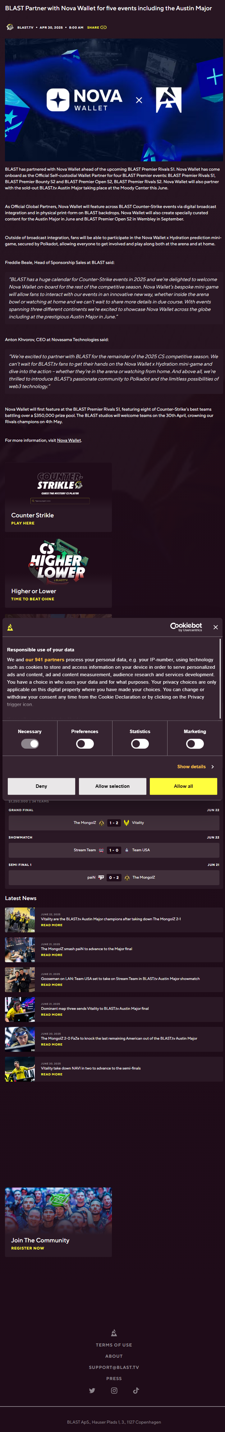 The partnership will see Nova Wallet integrated into BLAST Premier Rivals S1, BLAST Premier Bounty S2, BLAST Premier Open S2, and BLAST Premier Rivals S2. In addition, Nova Wallet will be a featured partner at the sold-out BLAST.tv Austin Major, set to take place this June at the Moody Center in Austin, Texas.