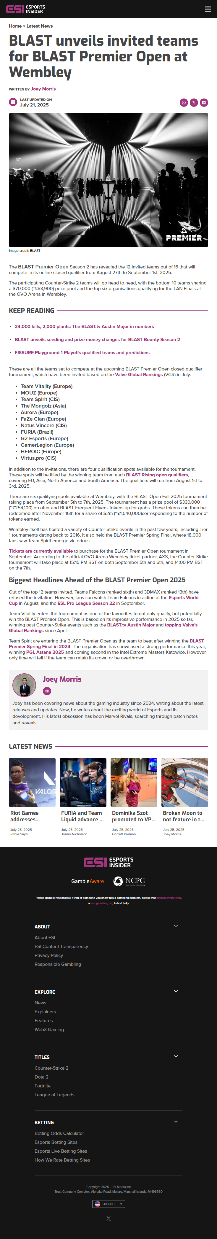 The path to Wembley is beginning to take shape as BLAST Premier Open Season 2 unveils 12 of the 16 teams set to compete in its online closed qualifier, scheduled from August 27 to September 1, 2025. The qualifier will determine which six squads advance to the highly anticipated BLAST Open Fall 2025 LAN Finals, held at London’s iconic OVO Arena in Wembley.