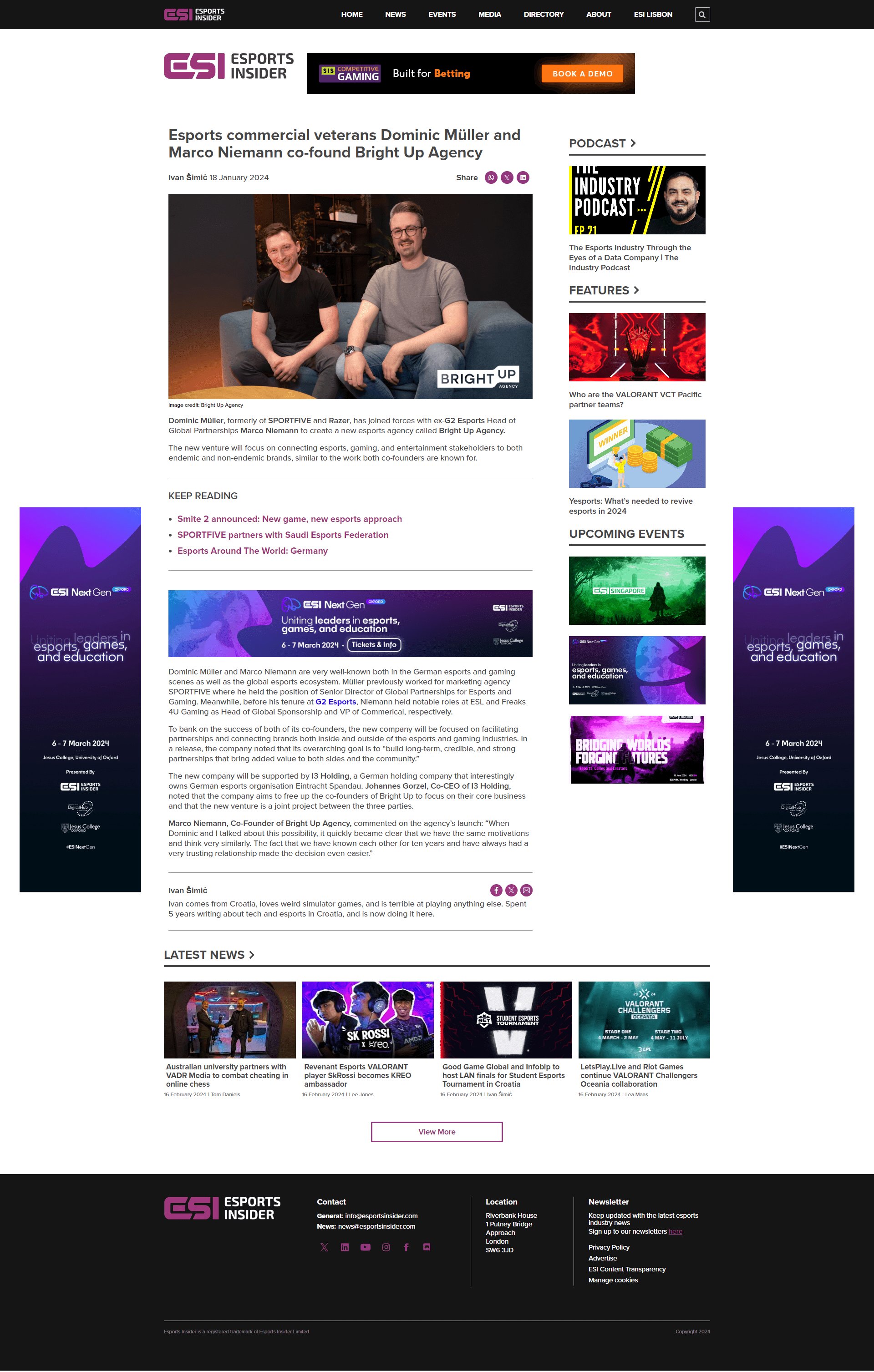 Dominic Müller, previously associated with SPORTFIVE and Razer, has collaborated with Marco Niemann, former Head of Global Partnerships at G2 Esports, to establish a new esports agency named Bright Up Agency.
