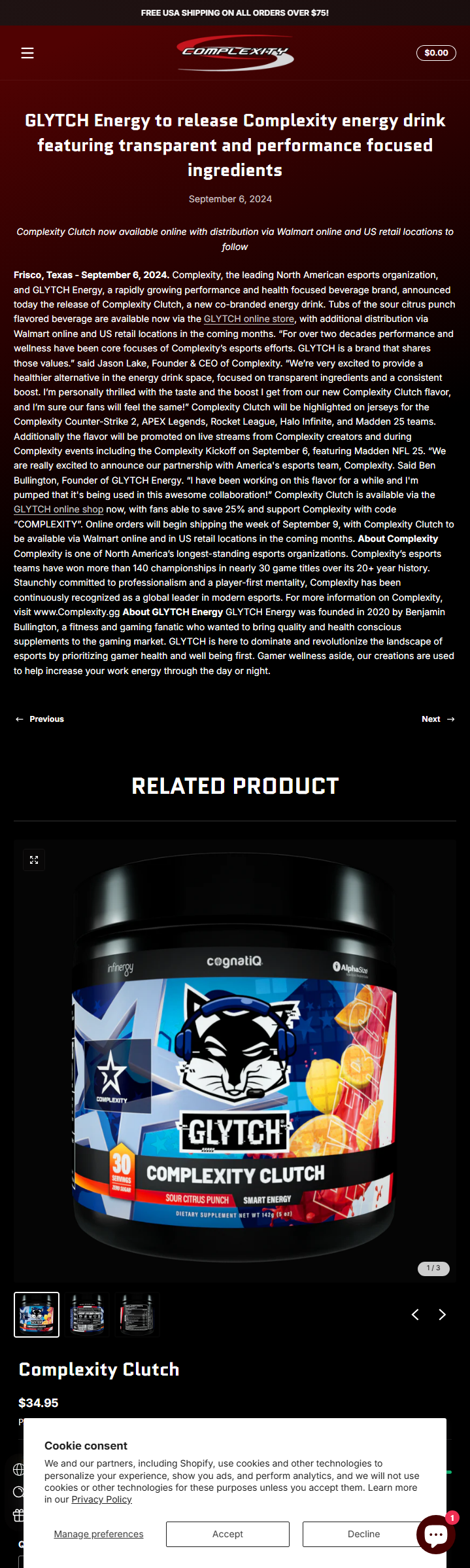 “We are really excited to announce our partnership with America’s esports team, Complexity. Said Ben Bullington, Founder of GLYTCH Energy. “I have been working on this flavor for a while and I’m pumped that it’s being used in this awesome collaboration!”