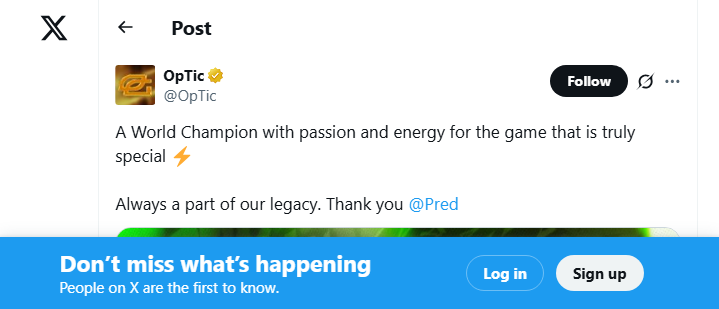 OpTic Gaming officially bid farewell to Pred today, thanking him for his “passion and energy” throughout his time with the team. The announcement comes just a few months after Pred moved to the inactive roster in December. At the time, he cited the need for a break to focus on his mental health and personal issues. Although he was still under contract with OpTic, Pred later confirmed he was a free agent.