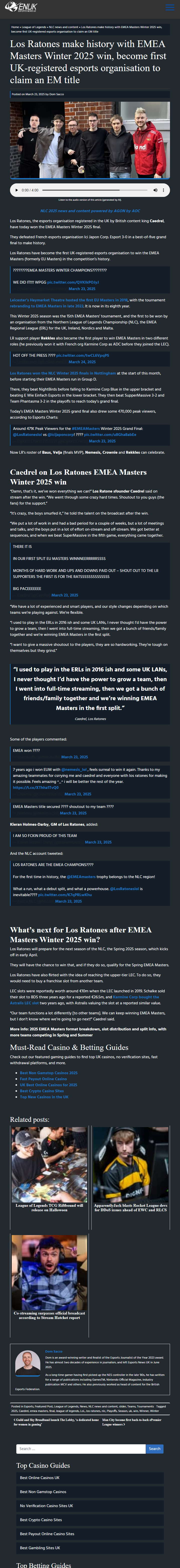 In a best-of-five grand final, Los Ratones triumphed 3-0 over the French esports organisation Ici Japon Corp. Esport, securing their place in the record books as the first UK-based team to ever win the prestigious EMEA Masters (formerly known as EU Masters). This Winter 2025 season marked the 15th iteration of the tournament, and it was the first time a team from the Northern League of Legends Championship (NLC)—the EMEA Regional League covering the UK, Ireland, Nordics, and Malta—took the crown.