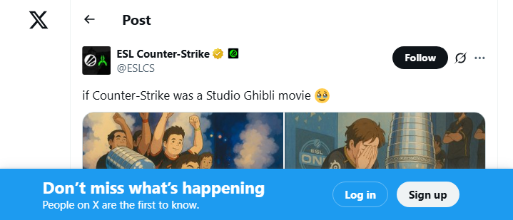 A tweet from ESL's Counter-Strike account on March 26th, 2025, has sparked significant controversy among fans after the esports tournament organizer shared four AI-generated images with the caption "if Counter-Strike was a Studio Ghibli movie." What was intended as a nostalgic nod to iconic moments in the game has instead been met with criticism for relying on AI-generated art instead of hiring a human artist.