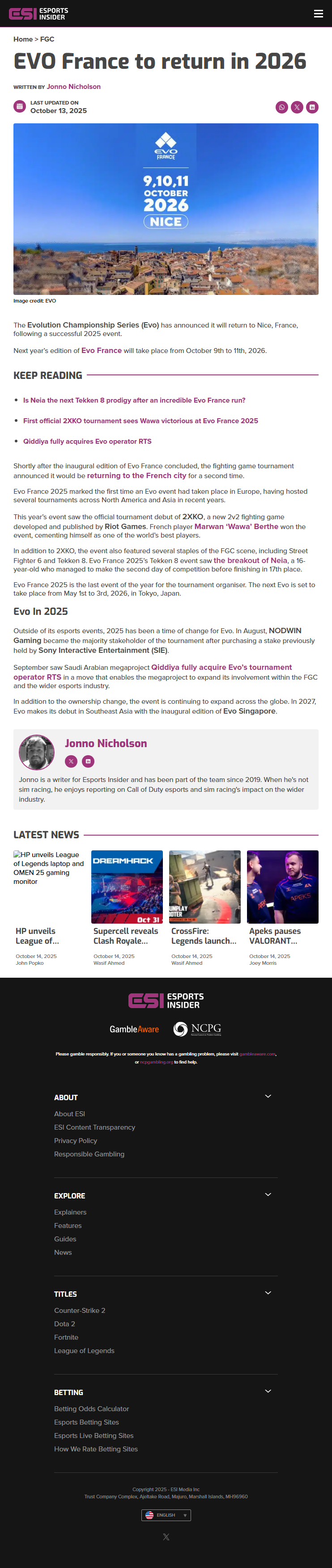 The Evolution Championship Series has confirmed that it will return to Nice, France, in 2026 following the success of its inaugural French event earlier this year. The second edition of Evo France is scheduled to take place from October 9th to 11th, 2026.