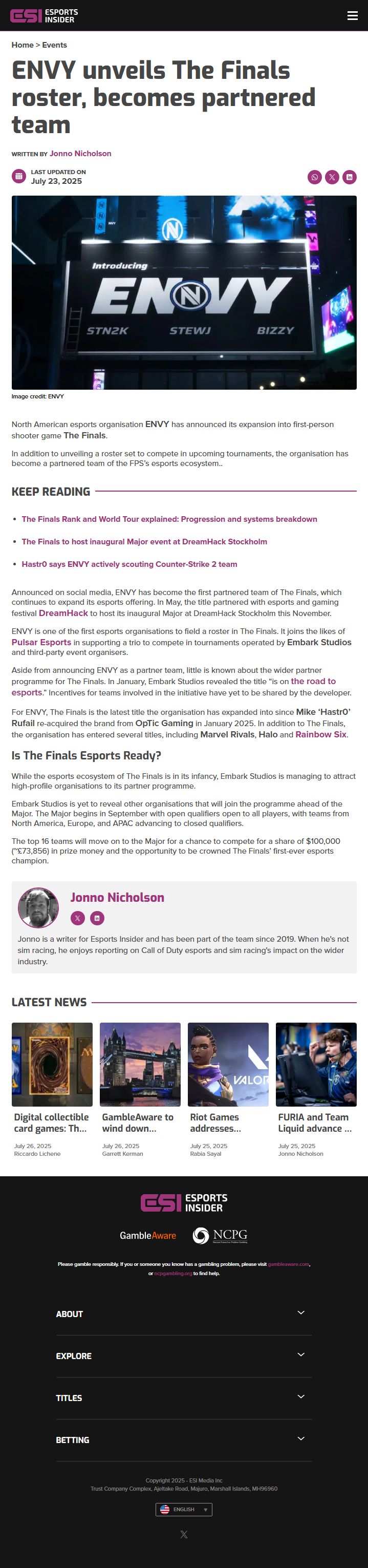 Since the re-acquisition in January 2025, ENVY has rapidly expanded into several emerging competitive titles, including Marvel Rivals, Halo, and Rainbow Six Siege. The organization’s entry into The Finals underlines its commitment to staking an early claim in the newest frontiers of esports.