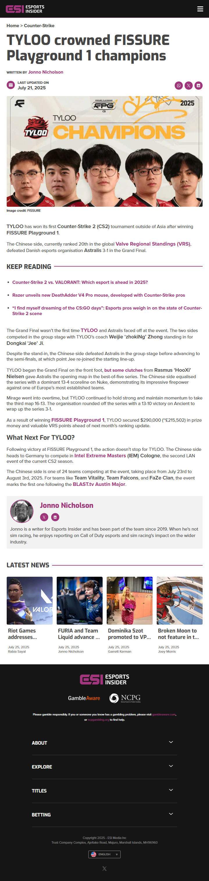 Chinese Counter-Strike team, TYLOO has claimed its first international CS2 title outside of Asia by winning the FISSURE Playground 1 tournament. The team defeated Danish giants Astralis 3-1 in a tense best-of-five Grand Final, securing a $290,000 grand prize and a historic international breakthrough.