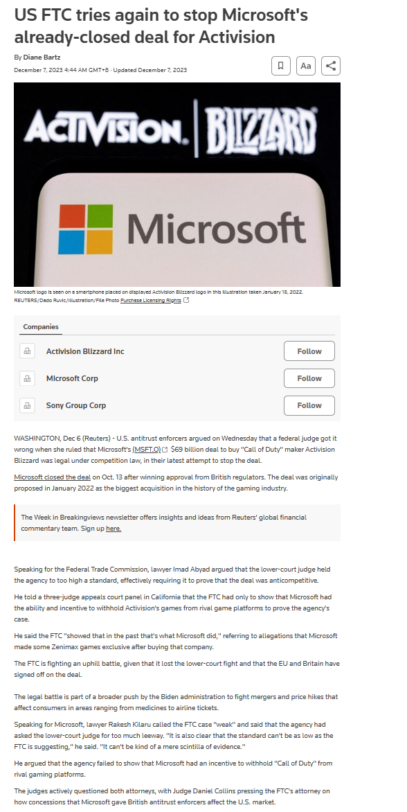News/FTC Aims to Block Microsoft-Activision Deal Again