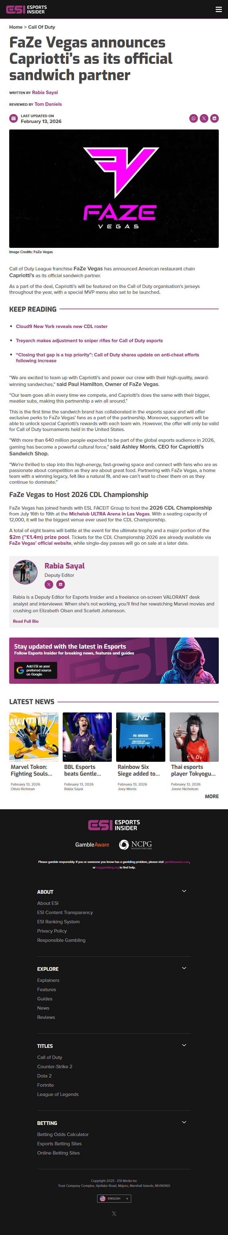 - Call of Duty League team FaZe Vegas has partnered with Capriotti’s as its official sandwich sponsor.