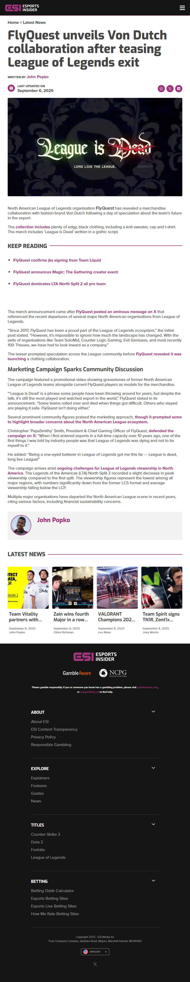 The collection, which includes black-themed apparel such as a knit sweater, cap, and t-shirt, is unified by the phrase “League is Dead” emblazoned in gothic script — a provocative statement that has become central to the campaign’s message. The merch drop was accompanied by a cinematic promotional video featuring gravestones bearing the names of now-defunct North American teams and FlyQuest players modeling the new gear.