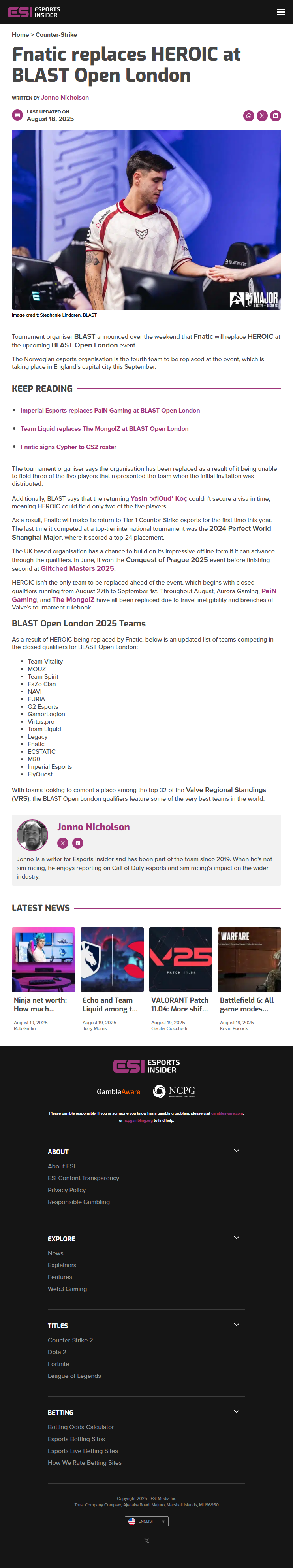BLAST has confirmed that UK-based esports organisation Fnatic will step in to replace HEROIC at the upcoming BLAST Open London tournament, scheduled to take place this September in the heart of England’s capital.