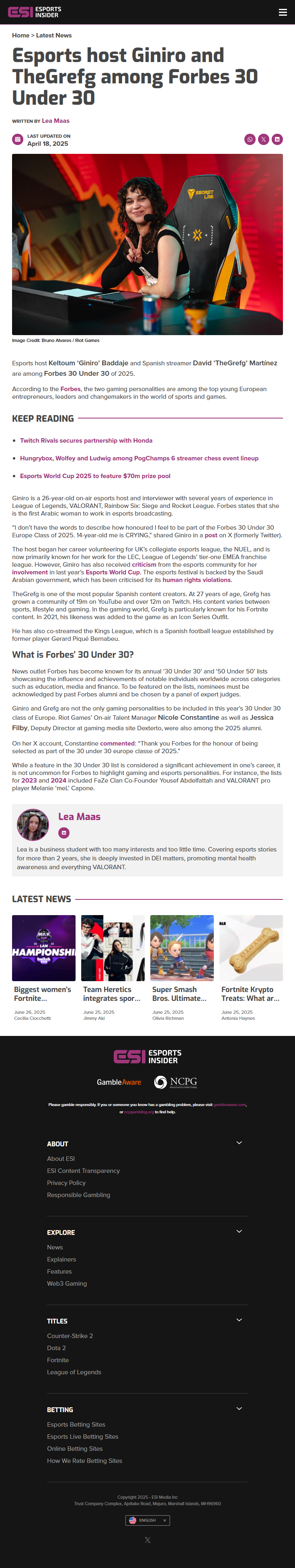 Esports host Keltoum ‘Giniro’ Baddaje and Spanish streaming sensation David ‘TheGrefg’ Martínez have been named to the prestigious Forbes 30 Under 30 Europe Class of 2025, under the “Sports & Games” category. The annual list recognizes young innovators, entrepreneurs, and changemakers shaping the future of their industries.