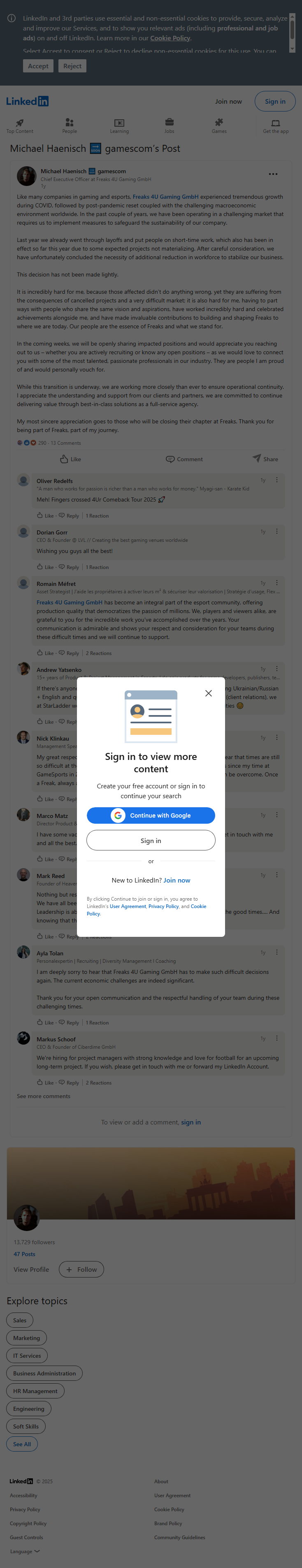 Freaks 4U Gaming, a Berlin-based marketing agency founded in 2011, has recently laid off an unspecified number of employees. The announcement was made by the company's CEO, Michael Haenisch, through a LinkedIn post.