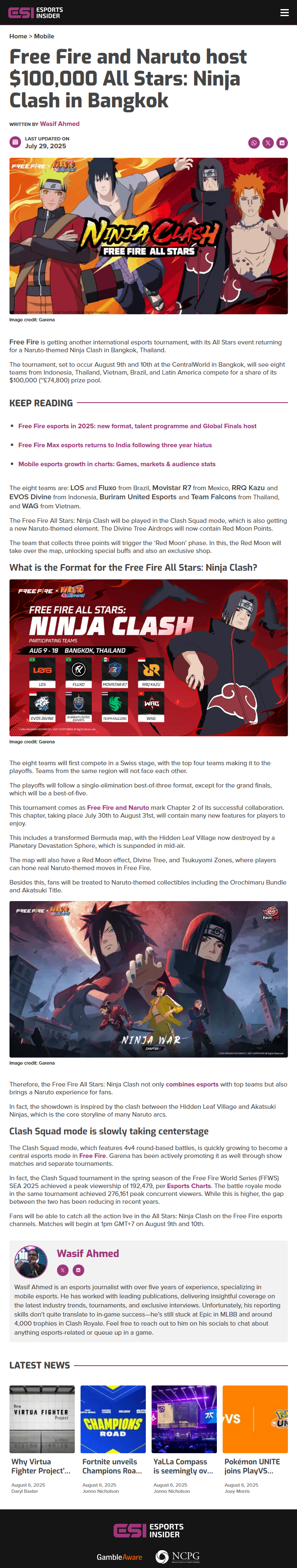 Garena has officially announced the return of its global Free Fire All Stars tournament, this time with a striking Naruto-themed twist. Titled Ninja Clash, the international event will unfold on August 9–10 at CentralWorld in Bangkok, Thailand, bringing together top teams from across five regions to battle for a share of the $100,000 prize pool.