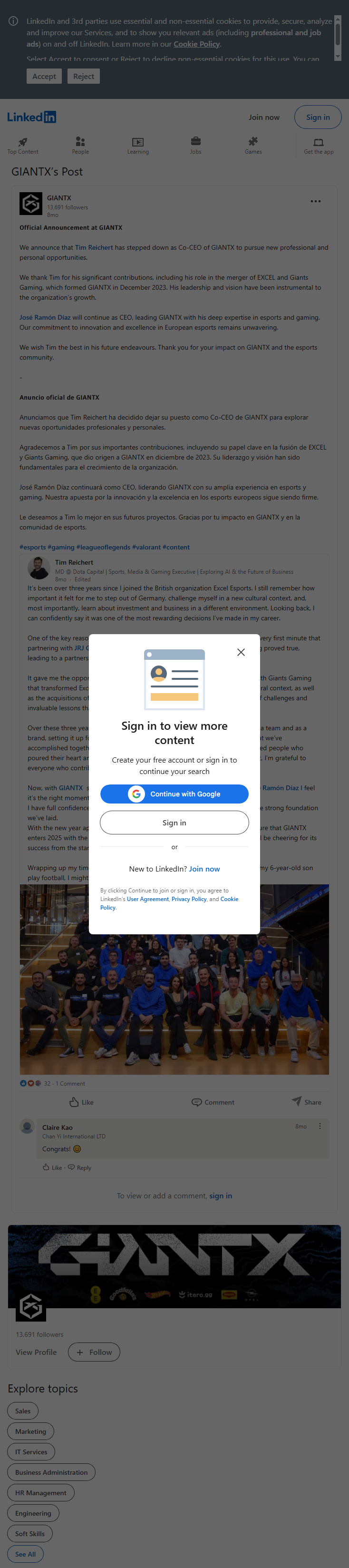 Tim Reichert has announced his departure from GIANTX, in a LinkedIn post. As a result, Jose Ramon Diaz, the other co-CEO of GIANTX, will take over as the sole leader of the company. Diaz, who was previously CEO of Giants Gaming, became co-CEO following the merger of his organization with EXCEL Esports in late 2023.