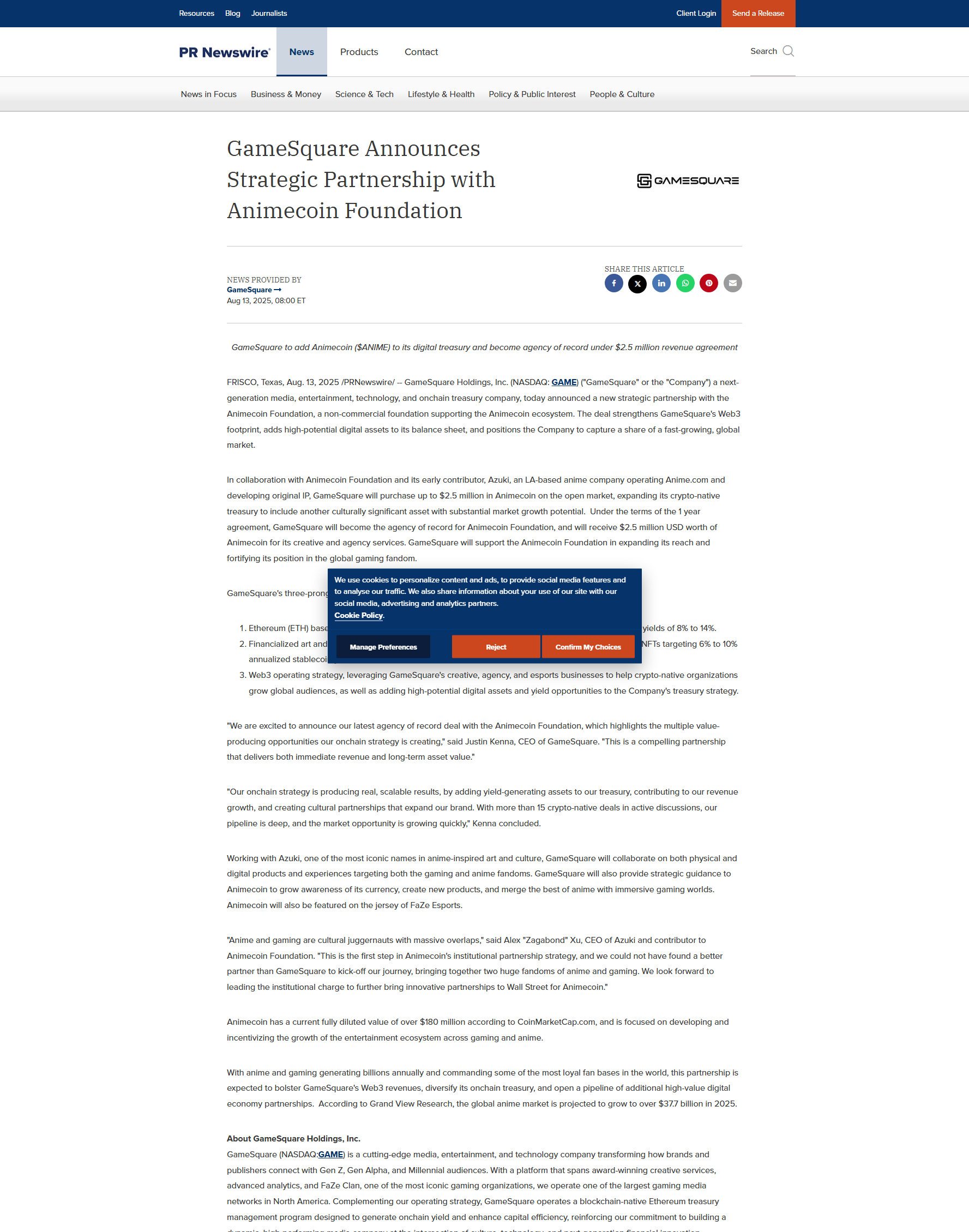 As part of the one-year agreement, GameSquare will provide $2.5 million worth of creative and agency services to the Animecoin Foundation, which is backed by Azuki — an LA-based anime company known for operating Anime.com and creating original anime IP. In return, the company will receive the equivalent value in Animecoin, expanding its digital asset holdings and exposure to the fast-growing anime and gaming fandom space.