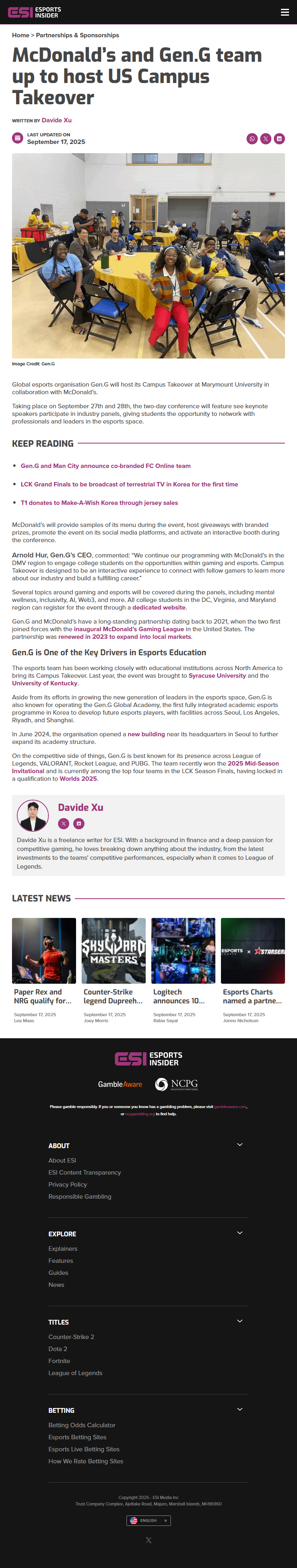 Gen.G is teaming up with McDonald’s to host Campus Takeover, a two-day esports and gaming career conference at Marymount University on September 27th and 28th. The event is tailored to college students in the DC, Maryland, and Virginia (DMV) area, offering networking opportunities, industry panels, and interactive experiences aimed at educating and inspiring the next generation of gaming professionals.