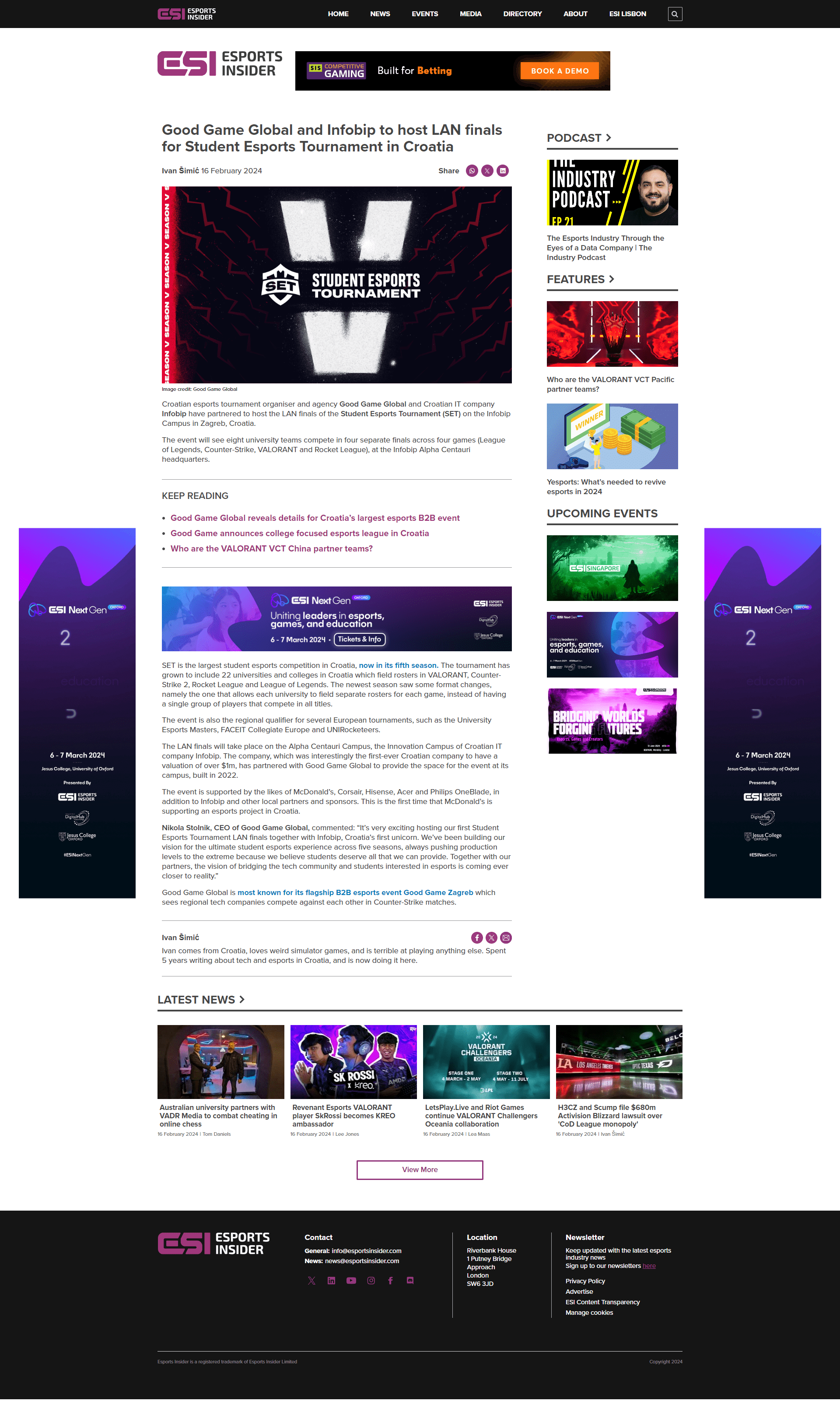 Good Game Global, has partnered with Croatian IT company Infobip to host the LAN finals of the Student Esports Tournament (SET) on the Infobip Campus in Zagreb, Croatia. The event will feature eight university teams competing in four separate finals across games like League of Legends, Counter-Strike, VALORANT, and Rocket League. Taking place at the Infobip Alpha Centauri headquarters, the LAN finals will be held on the Alpha Centauri Campus, Infobip's innovation hub. Infobip, the first Croatian company to reach a valuation of over $1 million, has collaborated with Good Game Global to provide the venue for the event at its campus, constructed in 2022. Nikola Stolnik, CEO of Good Game Global stated “It’s very exciting hosting our first Student Esports Tournament LAN finals together with Infobip, Croatia’s first unicorn. We’ve been building our vision for the ultimate student esports experience across five seasons, always pushing production levels to the extreme because we believe students deserve all that we can provide. Together with our partners, the vision of bridging the tech community and students interested in esports is coming ever closer to reality.”