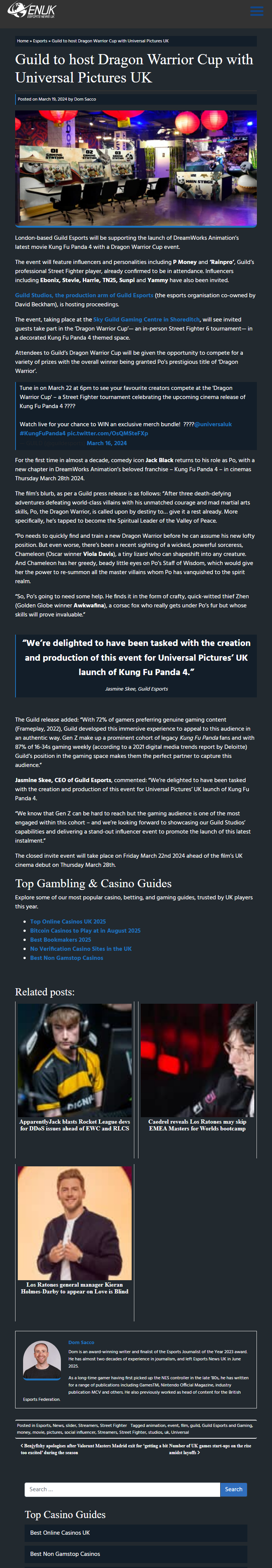 Guild Esports will be supporting the release of DreamWorks Animation's latest film, Kung Fu Panda 4, by hosting a Dragon Warrior Cup event in partnership with Universal Pictures UK. This event will feature influencers and personalities such as 'Rainpro', Guild's professional Street Fighter player. Guild Studios, the production arm of Guild Esports co-owned by David Beckham, will be overseeing the event. Held at the Sky Guild Gaming Centre in Shoreditch, attendees will compete in the 'Dragon Warrior Cup', an in-person Street Fighter 6 tournament set in a themed Kung Fu Panda 4 space. Participants will have the chance to win various prizes, with the ultimate winner receiving the title of 'Dragon Warrior'.