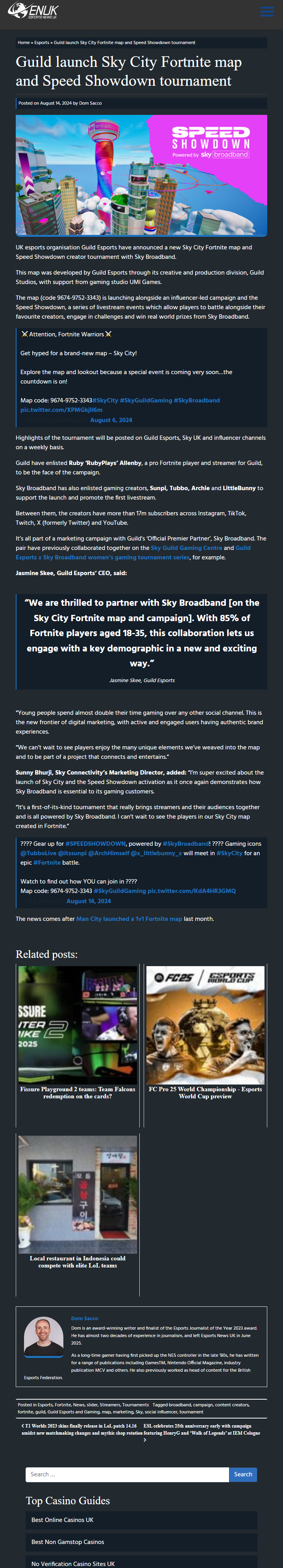 Guild Esports has unveiled a new Fortnite map, Sky City, in collaboration with Sky Broadband and gaming studio UMI Games. The map, available using the code 9674-9752-3343, has been developed by Guild Studios, Guild Esports' creative and production division.