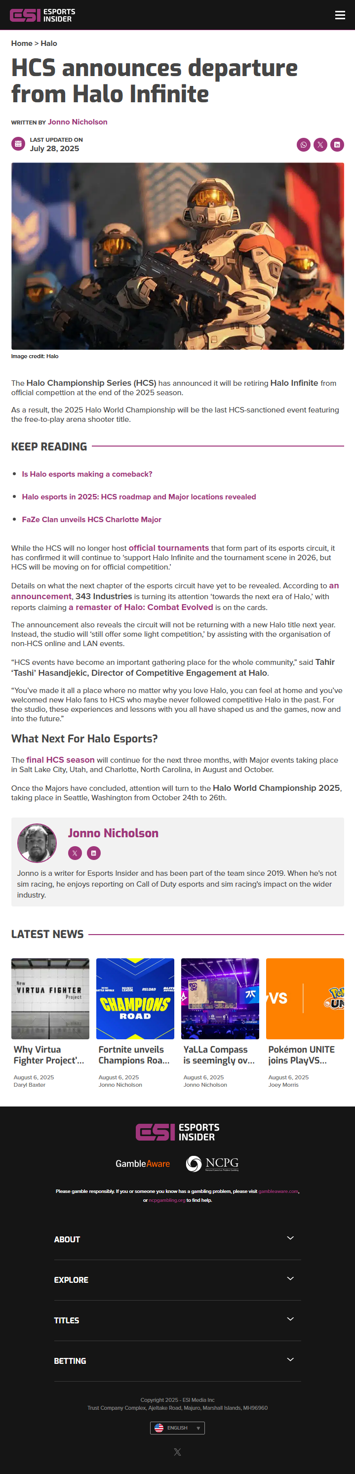 The Halo Championship Series (HCS) has confirmed it will retire Halo Infinite from official competitive play at the end of the 2025 season, marking the end of a multi-year esports run for the franchise’s free-to-play arena shooter.