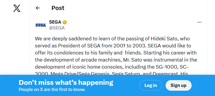 Sato joined Sega in 1971 and went on to become one of the most influential figures in the company’s history. Over several decades, he led the research and development teams responsible for creating Sega’s arcade systems and home consoles, including the Master System, Genesis or Mega Drive, Saturn, and Dreamcast. He also served as Sega’s acting president from 2001 to 2003 before leaving the company in 2008.