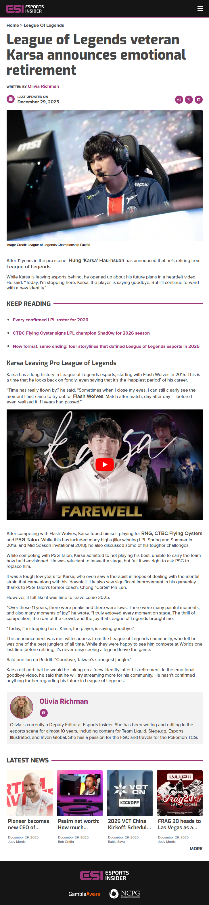 Hung ‘Karsa’ Hau-hsuan, one of the most recognized names in League of Legends esports, has officially announced his retirement from competitive play. The veteran jungler revealed the news in an emotional video, where he opened up about his journey and future plans. "Today, I’m stopping here. Karsa, the player, is saying goodbye. But I’ll continue forward with a new identity," Karsa shared, marking the end of an era for one of the most influential players in the game’s history.