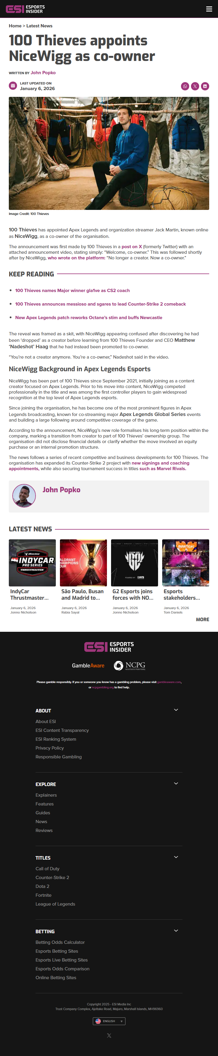100 Thieves has officially named Apex Legends personality Jack Martin, better known online as NiceWigg, as a co-owner of the esports organization. The announcement marks a major step in NiceWigg’s career and shows how content creators can grow into leadership roles within esports teams.