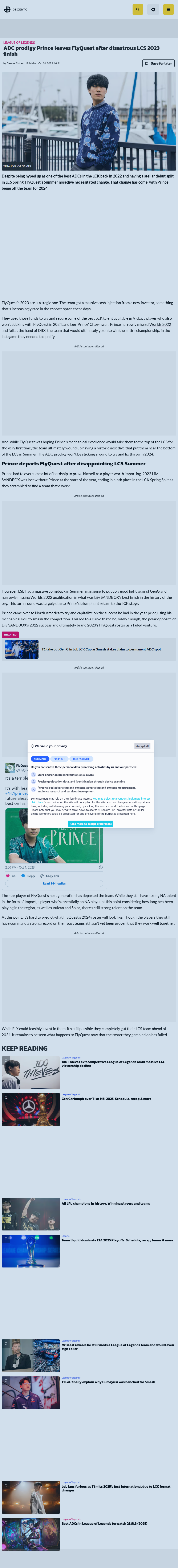 Lee "Prince" Chae-hwan will leave FlyQuest. Following an investment the organization aimed to win LCS however, they were unable to win and were not able to qualify for the Worlds. He joined from Liiv SANDBOX.