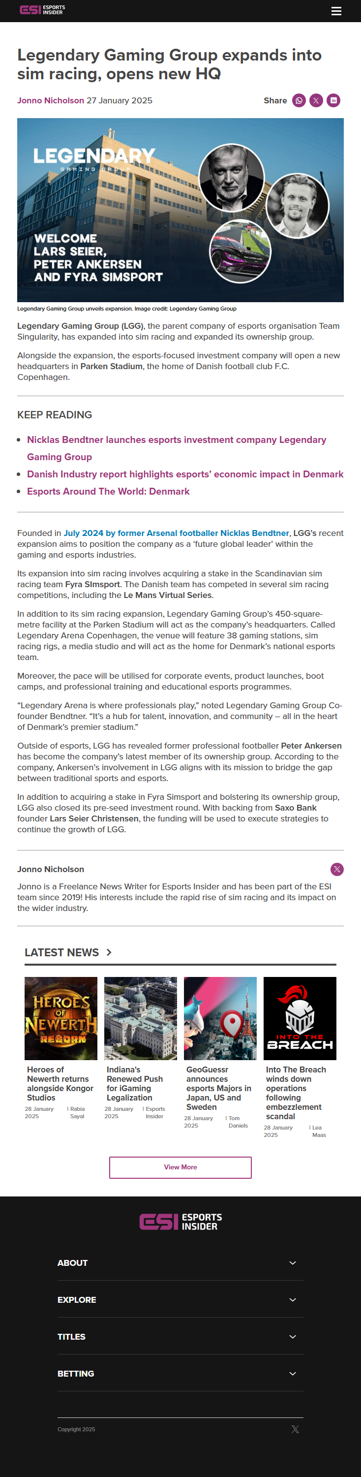 As part of this growth, the esports investment company is opening a new headquarters at Parken Stadium, the home of Danish football club F.C. Copenhagen. This expansion is part of LGG's strategy to position itself as a "future global leader" in the gaming and esports industries.