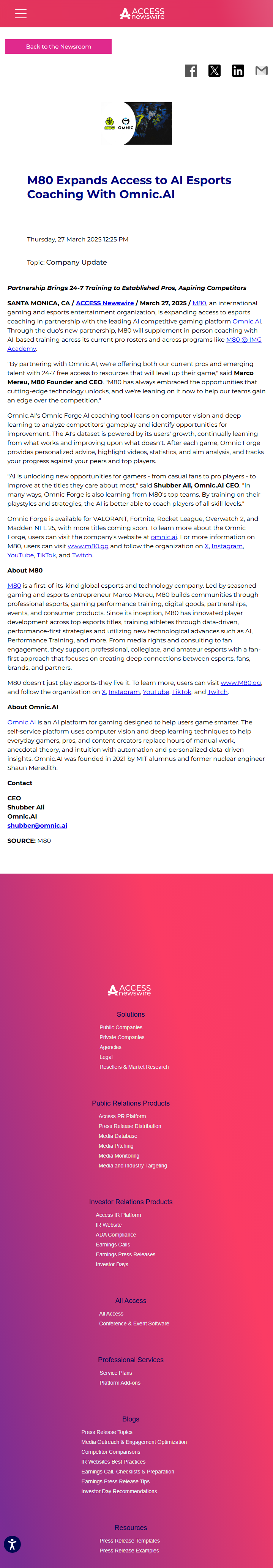 "By partnering with Omnic.AI, we're offering both our current pros and emerging talent with 24-7 free access to resources that will level up their game," said Marco Mereu, M80 Founder and CEO. "M80 has always embraced the opportunities that cutting-edge technology unlocks, and we're leaning on it now to help our teams gain an edge over the competition."