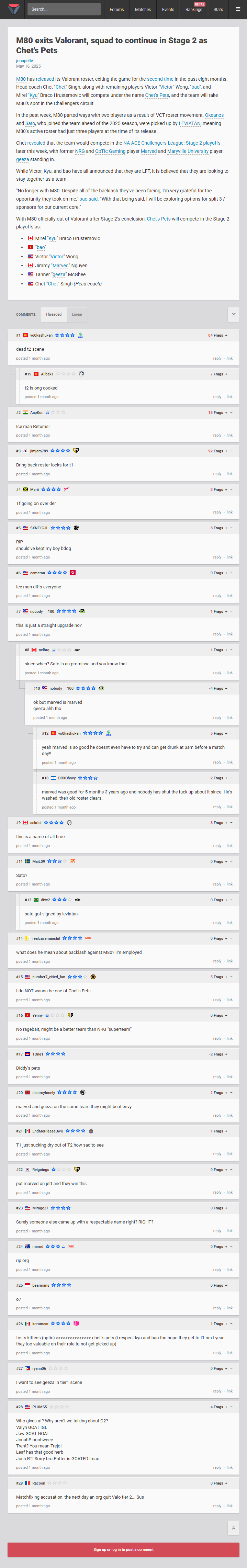 M80 has officially exited the Valorant scene for the second time in the past eight months, releasing its roster and leaving the competitive circuit. Head coach Chet "Chet" Singh, along with players Victor "Victor" Wong, "bao", and Mirel "Kyu" Braco Hrustemovic, will now compete under the new name "Chet's Pets" and take over M80’s spot in the Challengers circuit.