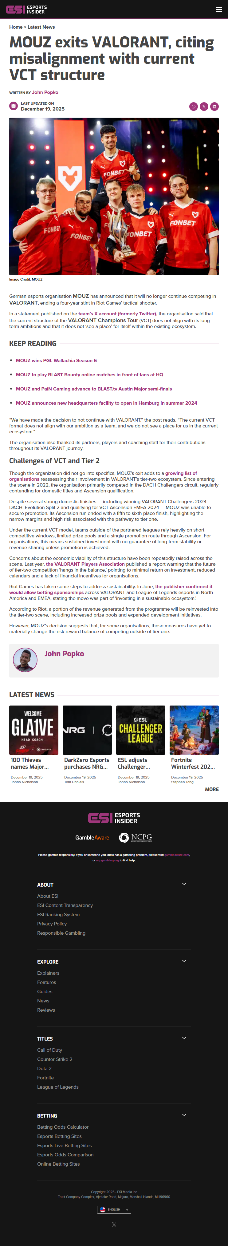 MOUZ’s exit highlights ongoing concerns around VALORANT’s tier two system. Teams outside the partnered leagues face short competition seasons, small prize pools, and only one promotion opportunity each year through Ascension.
