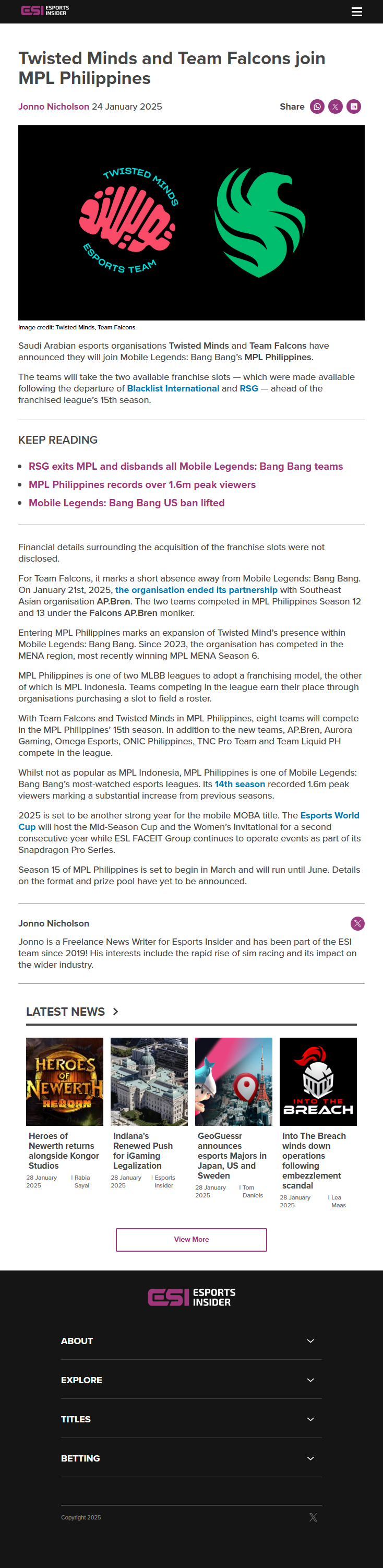 Twisted Minds and Team Falcons have secured the two available franchise slots in Mobile Legends: Bang Bang's MPL Philippines for its 15th season. These slots became available following the departure of Blacklist International and RSG. Financial terms of the acquisition were not disclosed.