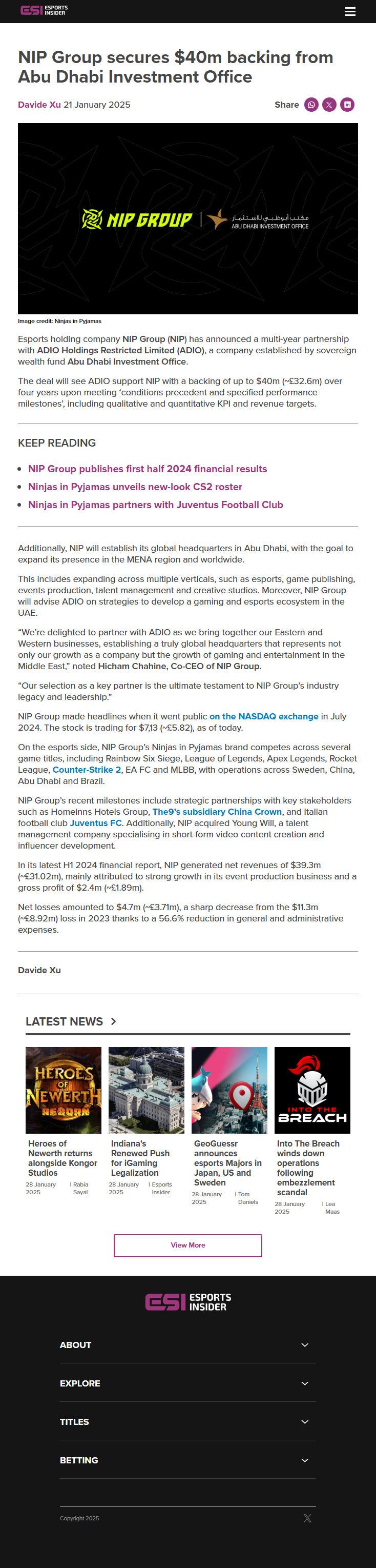 Under the agreement, ADIO will provide NIP with up to $40 million over four years, contingent on meeting certain conditions, including performance milestones, key performance indicators (KPIs), and revenue targets. As part of the deal, NIP will establish its global headquarters in Abu Dhabi, aiming to expand its footprint in the MENA region and beyond.