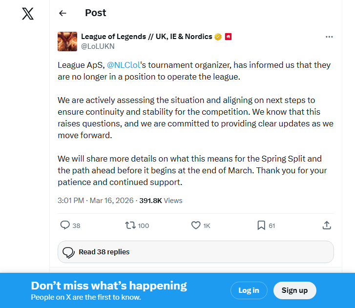 Riot's response was measured and non-committal on specifics: "We are actively assessing the situation and aligning on next steps to ensure continuity and stability for the competition... We will share more details on what this means for the Spring Split and the path ahead before it begins at the end of March. Thank you for your patience and continued support."
