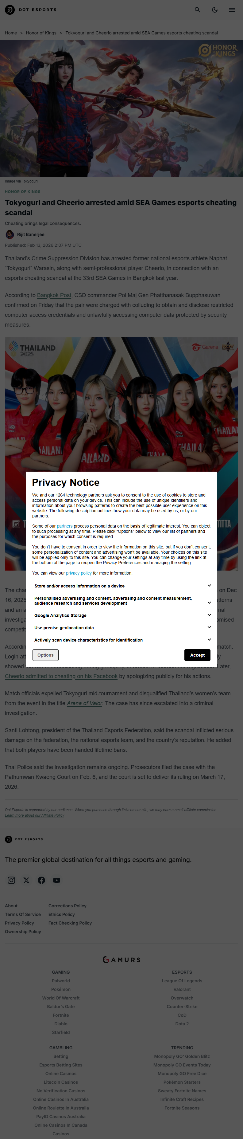 Thailand’s esports scene has been rocked by a major integrity scandal after the Crime Suppression Division arrested former national representative Naphat “Tokyogurl” Warasin and semi-professional player Cheerio in connection with alleged cheating at the 33rd Southeast Asian Games in Bangkok.